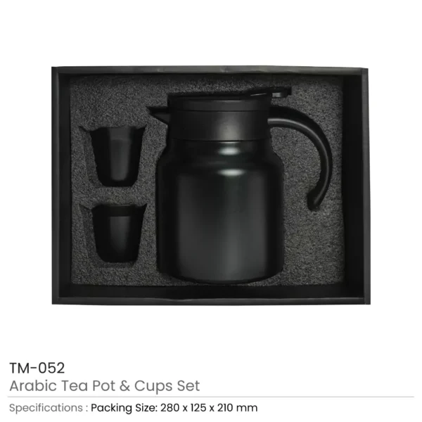 Arabic Tea & Coffee Pot with Cups Set presented in a black paper bag. Includes a vacuum thermal insulated pot with an infuser, and stainless steel cups. Keeps tea hot for hours with heat retention. Leak-proof and easy to clean with a matte oil finish.