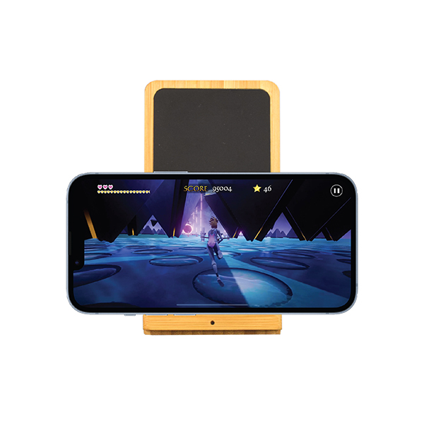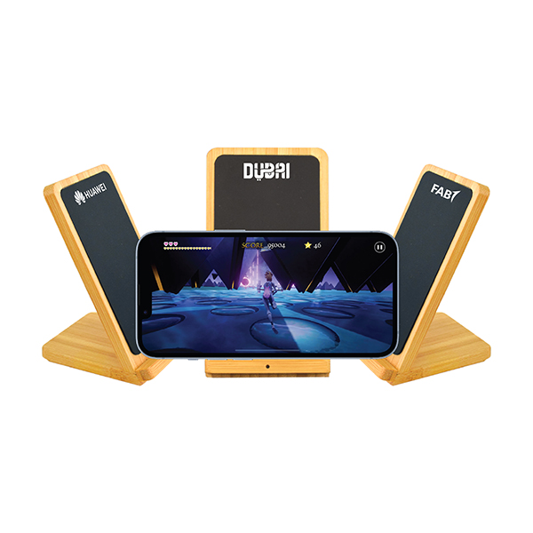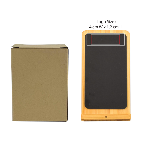 Bamboo wireless charger with stand functionality for phones, featuring LED logo. Product size: 72 x 70 x 113 mm. Printing options: Engraving, Screen printing.