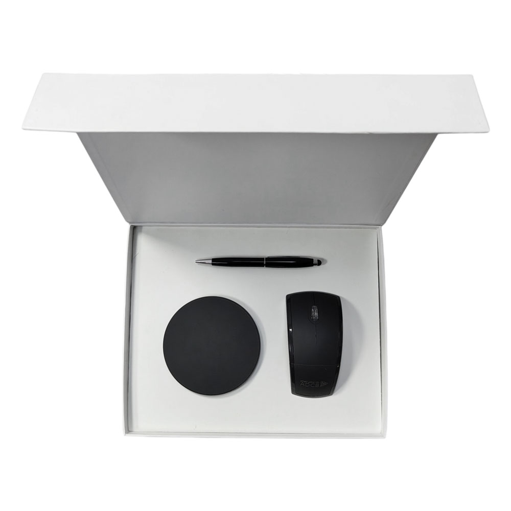 Set includes Wireless Charger, Metal Pen, Curved Mouse, Packaging: Large Black Box with Sleeve, Printing Options: Laser Engraving, Screen Printing & UV Printing