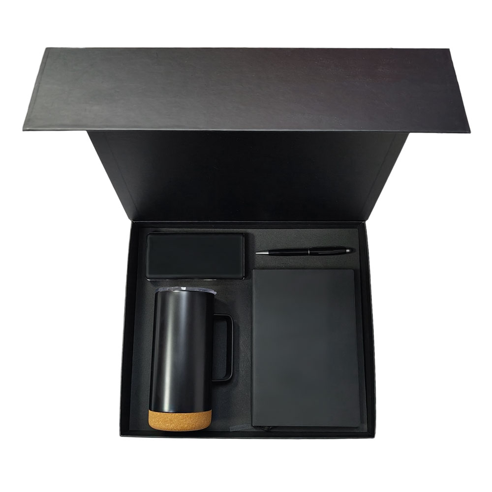 This elegant black gift set includes a powerbank, PU notebook, metal pen, and eco mug, all packaged in a large black box. Ideal for corporate gifting or special events, offering a sophisticated and practical gift.