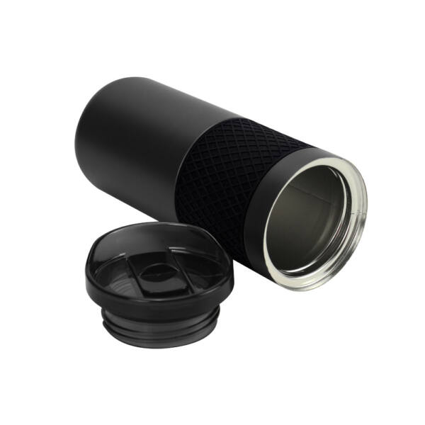 A stainless steel double wall bottle with a secure slide-lock lid, perfect for on-the-go hydration.
