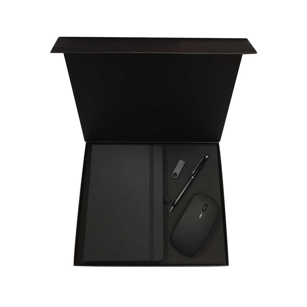 Set includes PU Notebook, Silent RGB Mouse, Slim Metal USB & Metal Pen, Packaging: Small White Gift Box with Sleeve, Printing Options: Laser Engraving, Screen Printing & UV Printing