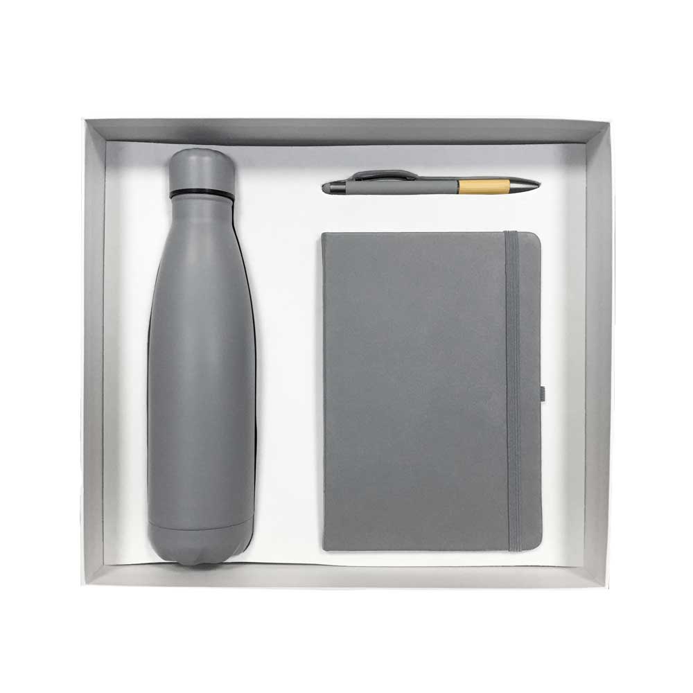 This luxurious gift set includes a metal bottle, PU notebook, and metal pen, all packaged in a large white gift box with sleeve, making it perfect for corporate gifts or special occasions where high-quality presentation matters.
