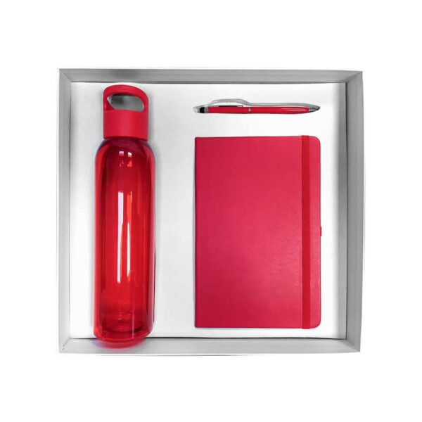 A vibrant and stylish gift set that includes a plastic bottle, PU notebook, and slim metal pen, all elegantly packaged in a large white gift box. This set is perfect for corporate giveaways or special personal gifts.