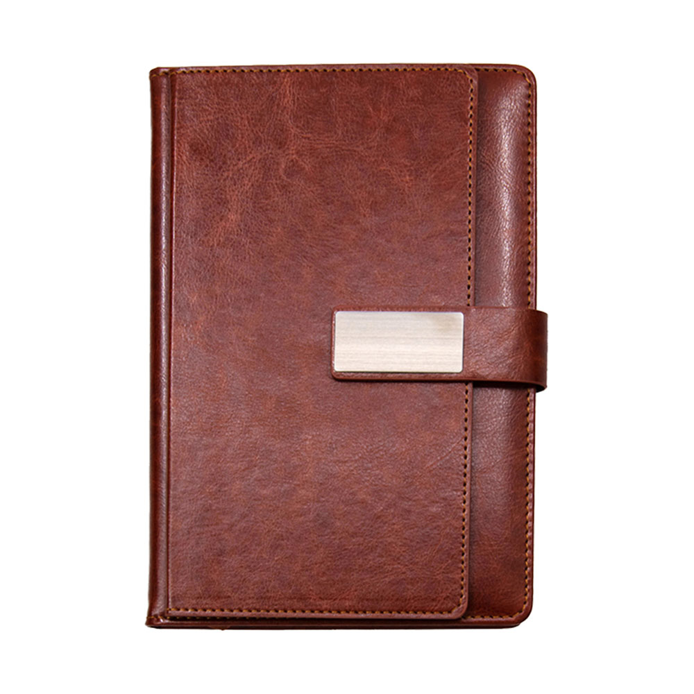 This brown PU leather notebook offers soft thermal material, card slots, and a metal engraving plate, making it a sophisticated option for personal use or a corporate gift that combines elegance with functionality.