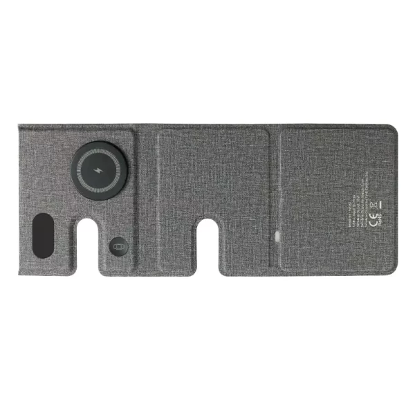 A foldable wireless charging station supporting simultaneous charging for a phone, watch, and earbuds, ideal for home or office use.