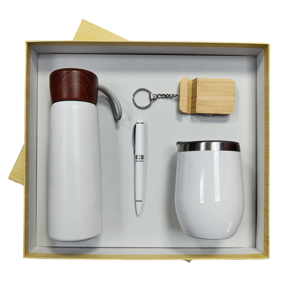 This eco-friendly gift set includes a sports bottle, wooden keyring, metal pen, and mug, all packaged in a large eco box. It’s perfect for corporate giveaways or eco-conscious events.