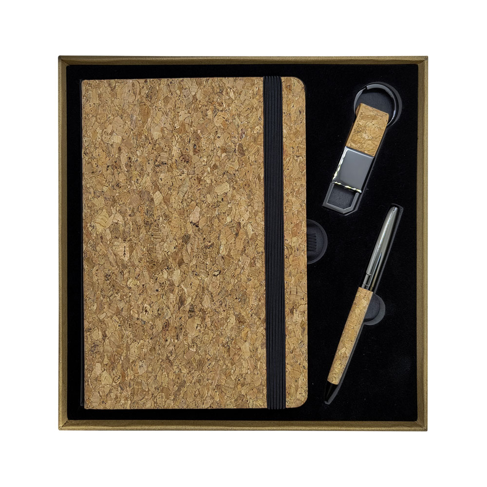This eco-friendly gift set includes a fabric notebook, metal pen, and keyring, all packed in a premium black box. Perfect for sustainable gifting and eco-conscious recipients.