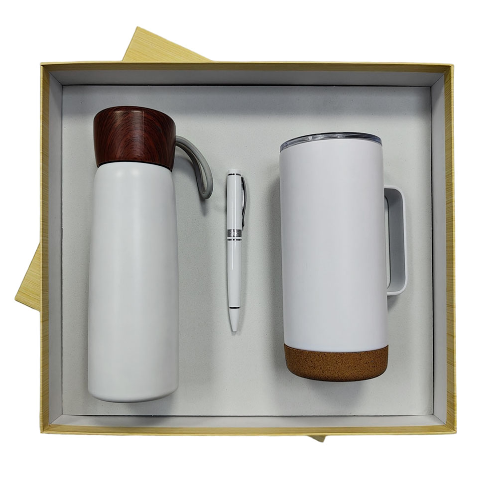 This eco-friendly gift set includes a sports bottle, metal pen, and eco mug, all packaged in a large eco box with sleeve. Perfect for sustainable gifting.