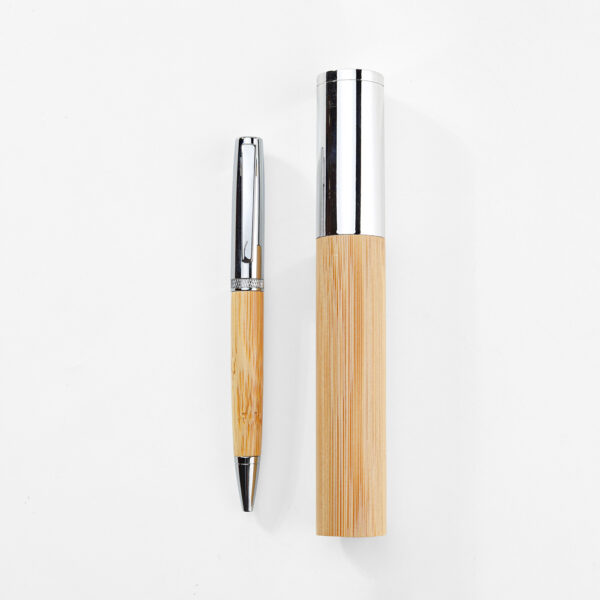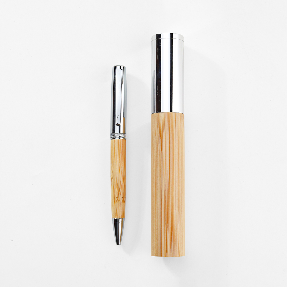 A luxurious metal and bamboo pen housed in a premium wooden case. This eco-friendly writing instrument offers a blend of sustainability and elegance.