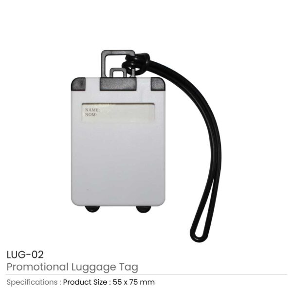White luggage tags made from durable plastic with a unique design, perfect for travel businesses. Customizable with branding.