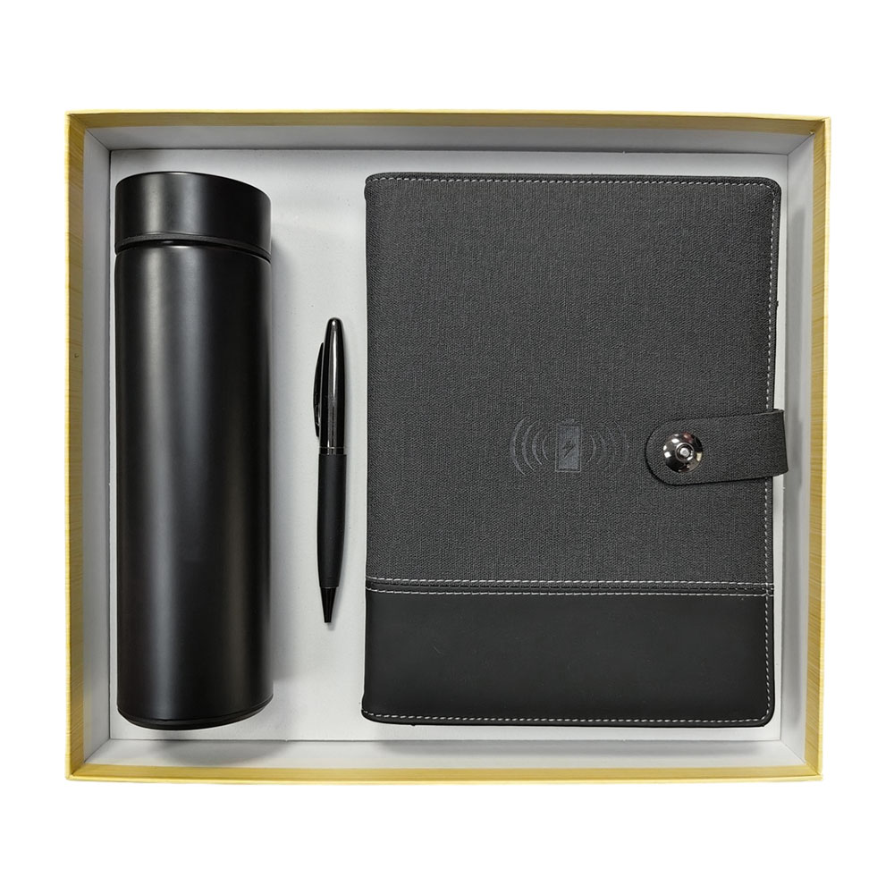 A premium eco gift set featuring a black page-end PU notebook, powerbank, metal pen, and cube speaker, all packed in an eco-friendly box.