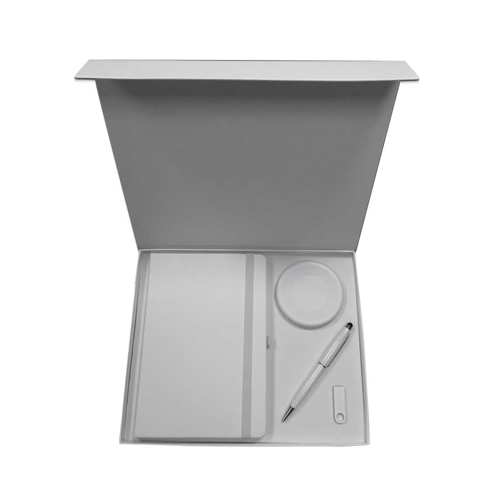 A compact white gift set featuring a PU notebook, metal USB, travel charging kit, and metal pen, perfect for business promotions.