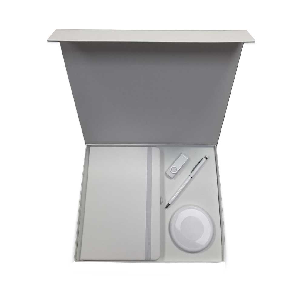 A white gift set with a PU notebook, travel kit, slim USB, and slim metal pen, perfect for client gifts or employee appreciation.