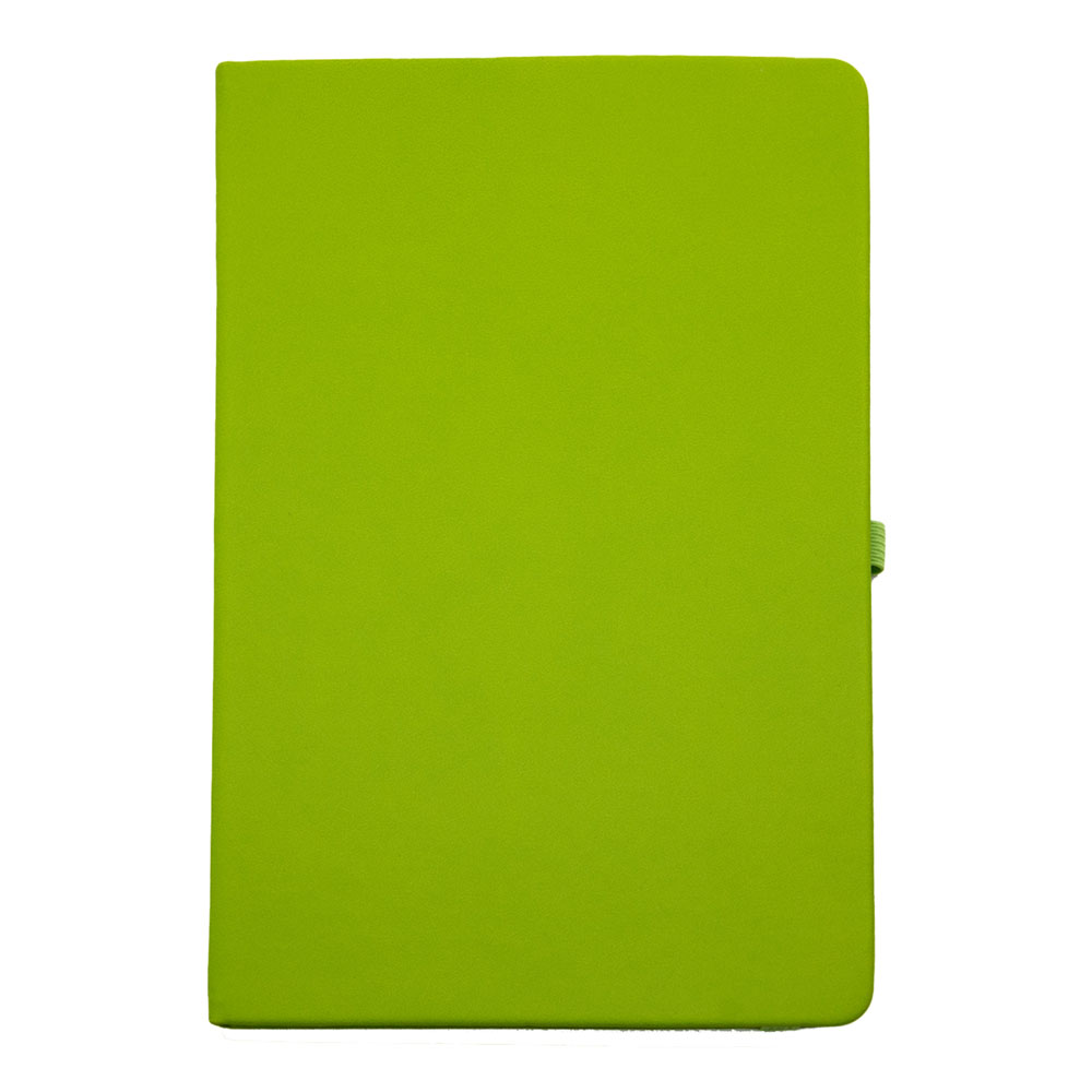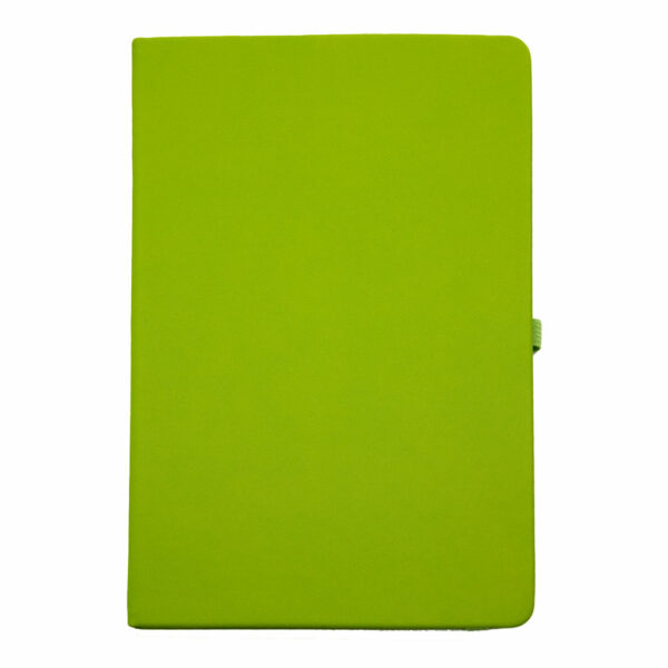 A high-quality soft PU leather notebook in light green, A5 size with a convenient pen loop for easy writing access.