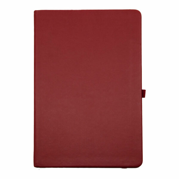 A maroon-colored, high-quality soft PU leather notebook with an A5 format and built-in pen loop, perfect for organizing your thoughts with elegance.