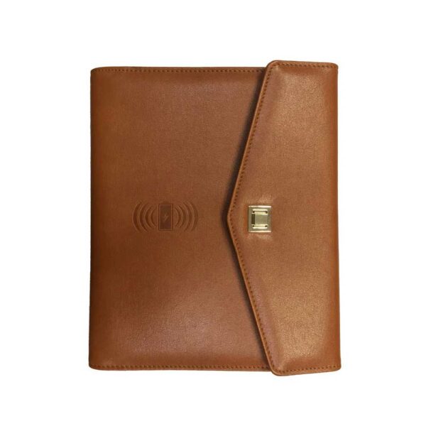 This brown PU leather organizer combines modern features such as a built-in 10,000 mAh powerbank, wireless charging, and a sleek design.