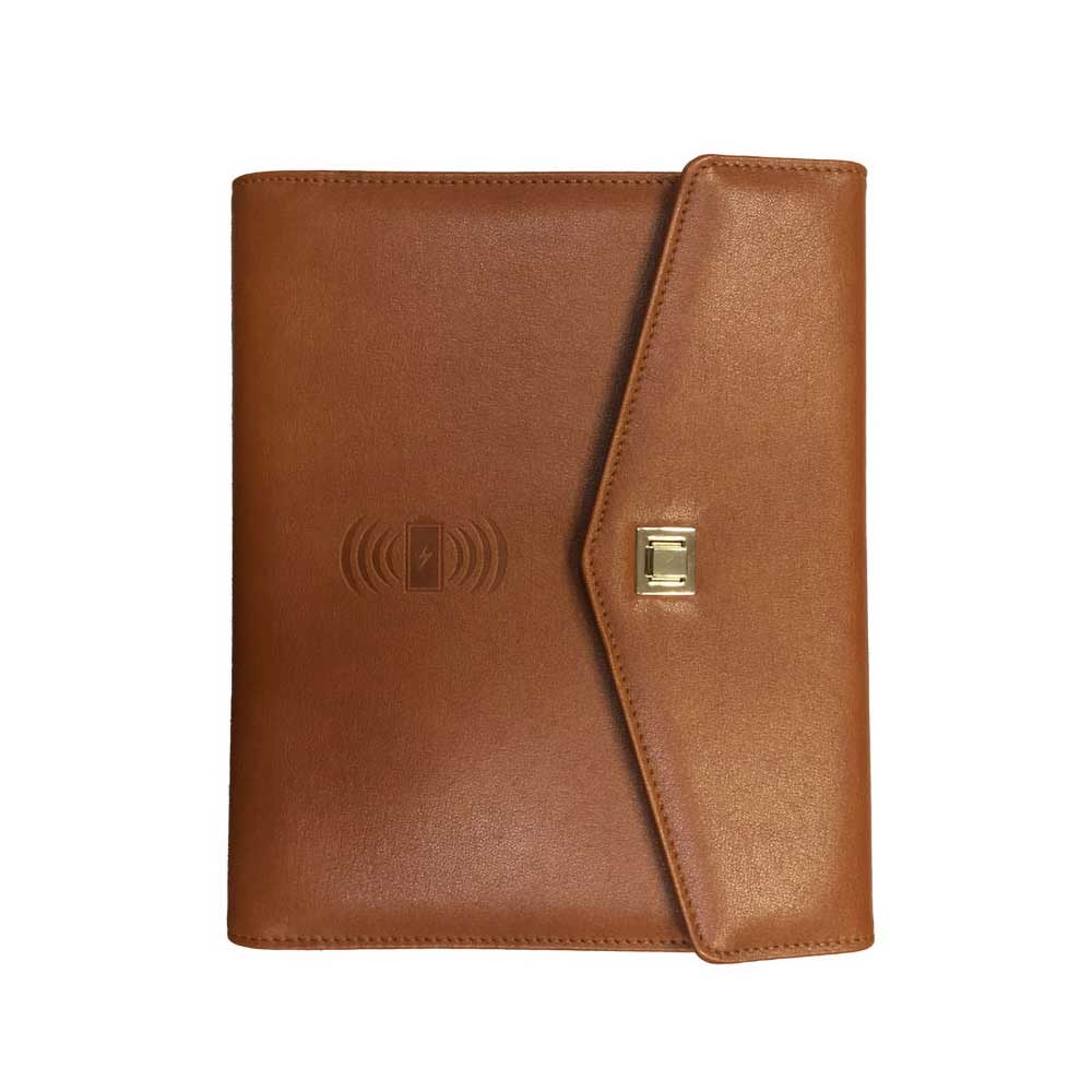 A luxurious A5 organizer with a 10,000 mAh powerbank and wireless charging, designed in brown PU leather.