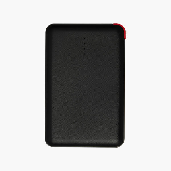 A portable 5000 mAh mini powerbank with built-in cable and Lightning port converter, designed for on-the-go charging.