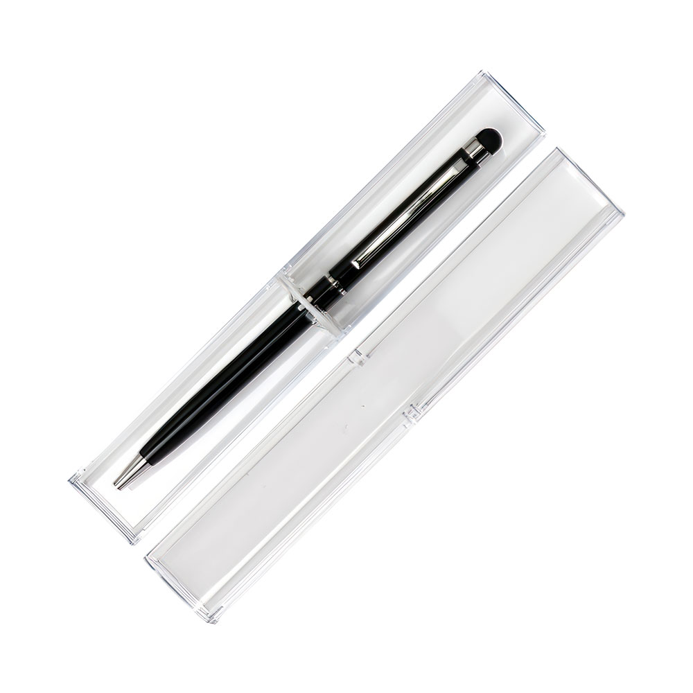 A high-quality clear rectangular plastic box with rubber pen grip, perfect for presentation and gift packaging.