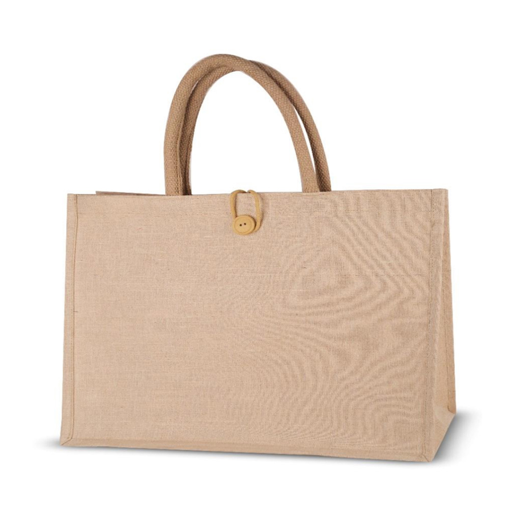 Eco-friendly wide laminated juco bag with button loop, perfect for carrying everyday essentials.