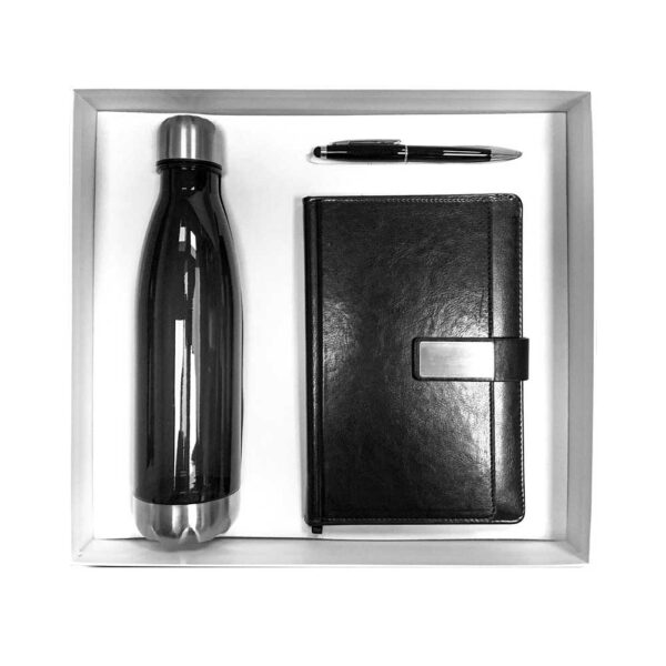 Premium black gift set featuring a plastic bottle, PU leather notebook, and metal pen, all in a large white gift box.