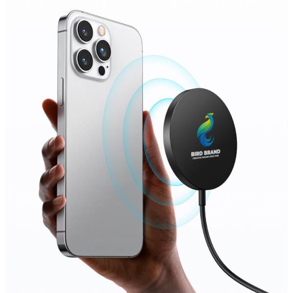 A sleek magnetic 15W fast wireless charger using Type-C for rapid charging, designed for efficient use with compatible devices.