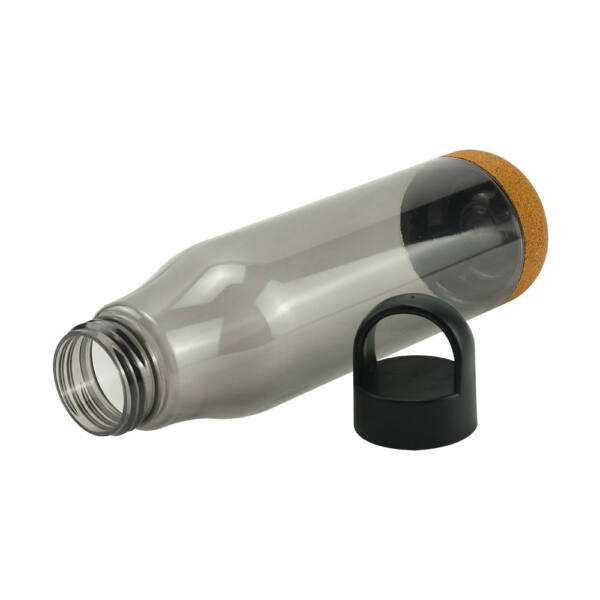 A sustainable rPET bottle with a cork base, twist-off lid, and handle for ease of use, perfect for everyday hydration.