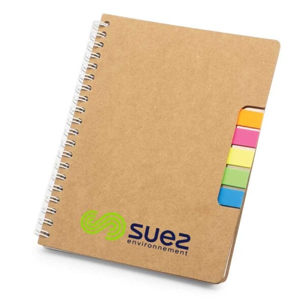 Spiral-bound notebook with sticky notes, pen holder, and recycled cardboard cover.
