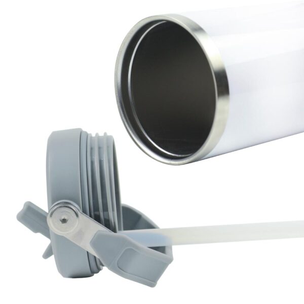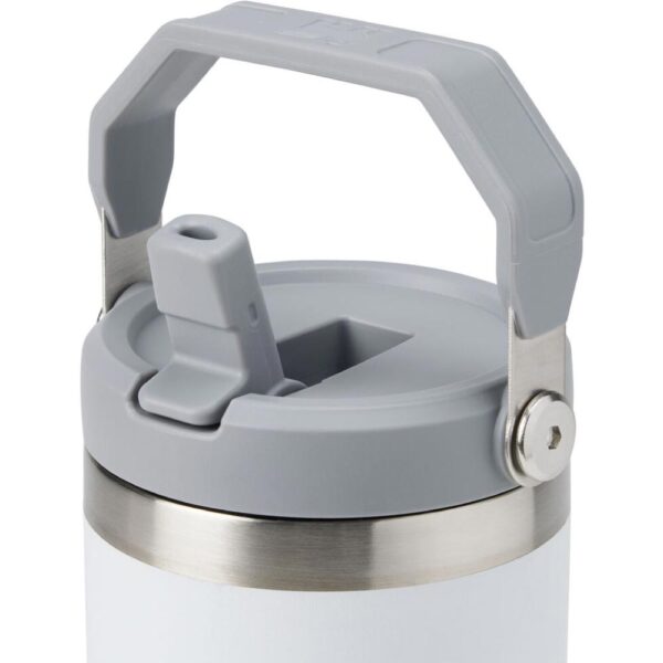 A vacuum-insulated tumbler with a flip-straw lid, carry handle, and stainless steel construction, designed to maintain beverage temperature for hours.