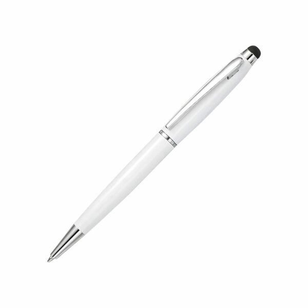 The Turin White pen features a sleek, glossy metal finish with a chrome tip and universal stylus. This pen is perfect for both writing and touchscreen applications. Customization options include laser engraving, screen printing, and UV printing, making it ideal for corporate gifting or promotional use.